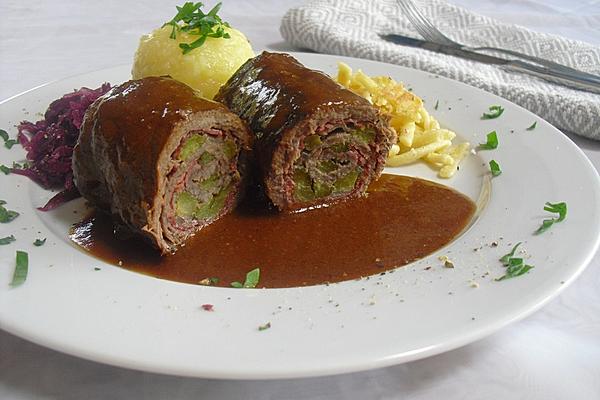 Die ausgebreiteten Rouladen dünn mit Senf bestreichen, salzen und pfeffern. Auf jede Roulade mittig in der Länge ca. 1/2 Zwiebel und 1 1/2 Scheiben Frühstücksspeck sowie 1/2 (evtl. mehr) Gurke verteilen. Nun von beiden Längsseiten etwas einschlagen, dann aufrollen und mit dem Küchengarn wie ein Postpaket verschnüren.